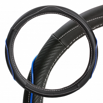 Оплетка на руль, искусст. кожа, текстура карбон, черная/синяя, бел. прошивка, 38 см/М