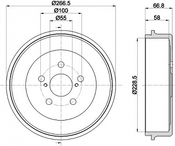 Диаметр центрирования55Диаметр располож. креп. отверстий100Внутр. высота торм. барабана58Общая высота торм. барабана66.5Количество отверстий5Наружный диаметр, мм266.5Максимальный размер расточки тормозного барабана229.6Разболтовка (PCD)5*100Гарантийный срок2 года / 60 000 кмСторона установкиЗадняя осьСопутствующий товар: Колодки тормозные барабанныеGF 4817Сопутствующий товар: Цилиндры заднего тормозаCF 1950Количество в коробке, шт.2Внутренний диаметр торм. барабана229Количество на автомобиль2МатериалСерый чугунТоварная линейкаBLACKОбъем, м30.005Вес, кг.7.55Гарантийный срок2 года / 60 000 кмСтрана изготовленияКитай